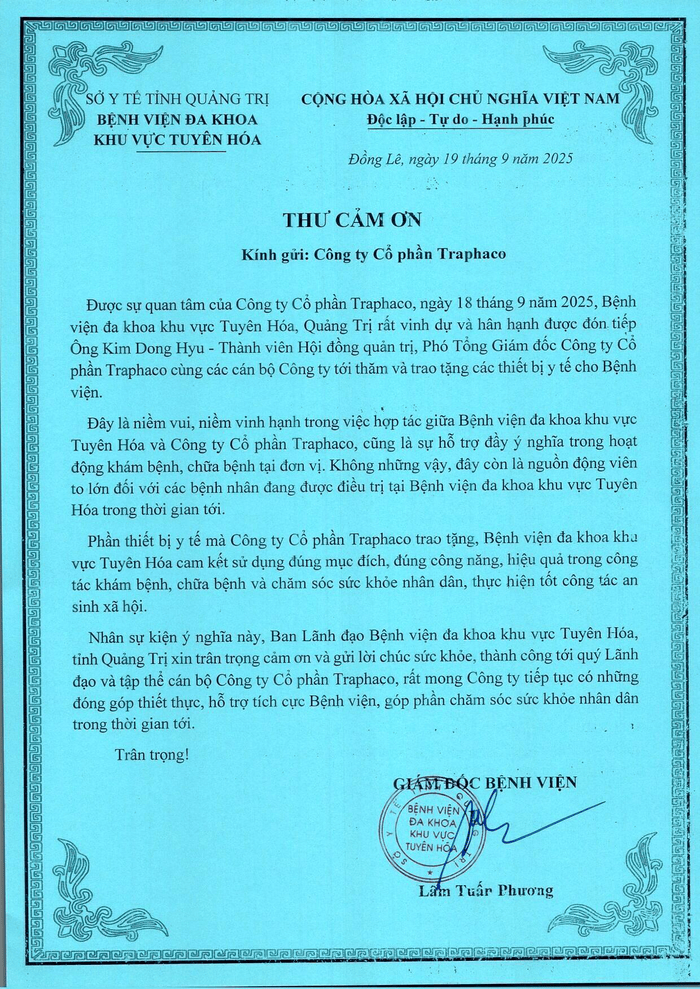 Ngày 18/9/2025, Công ty cổ phần Traphaco đã đến trao tặng một số thiết bị y tế thiết yếu cho Bệnh viện đa khoa khu vực (BVĐK KV) Tuyên Hóa, tỉnh Quảng Trị. Đây là hoạt động thiết thực nhằm chung tay nâng cao chất lượng khám chữa bệnh, chăm sóc sức khỏe ban đầu cho người dân trên địa bàn.