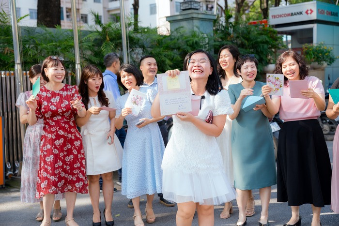 Phần bí mật và bùng nổ nhất của buổi lễ hôm nay là khoảng khắc chị em được tự tay chọn cho mình 1 tấm thiệp bên trong chứa đầy yêu thương và sự bất ngờ. Những tấm thiếp này được các anh em nam giới trong công ty, cặm cụi tỉ mỉ chuẩn bị cả tuần trước. Các anh tự tay viết thiệp, gửi gắm trong đó là tình cảm yêu thương, trân quý dành cho các chị em đồng nghiệp và những món quà bất ngờ, thú vị.
